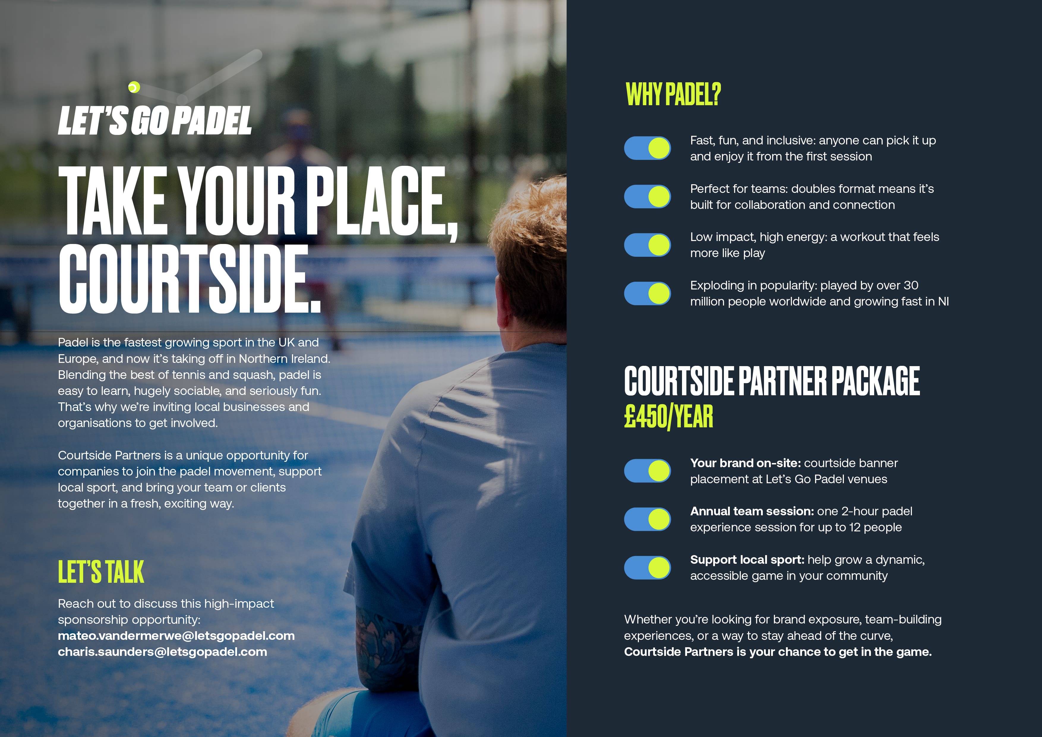 Be part of NI's fastest-growing sport! Join our Courtside Partner Programme for just £450/year- get your banner displayed at your chosen venue, enjoy a private padel session, support the growth of padel across Northern Ireland. Contact us for information regarding title sponsorship options.